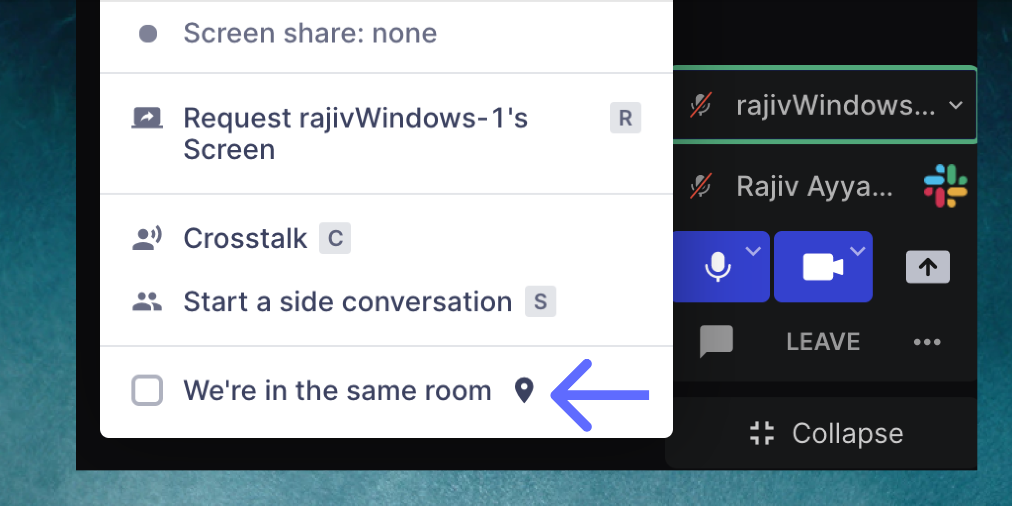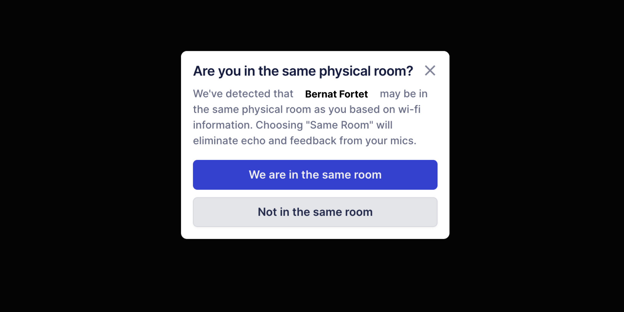 Selecting 'We're in the same room' prevents audio feedback on hybrid calls (i.e. when some participants are in-person and some are remote). For example, if Vivy selects "Same room" with Cyrus, then Vivy and Cyrus will not hear each others' audio, but other participants will hear them.