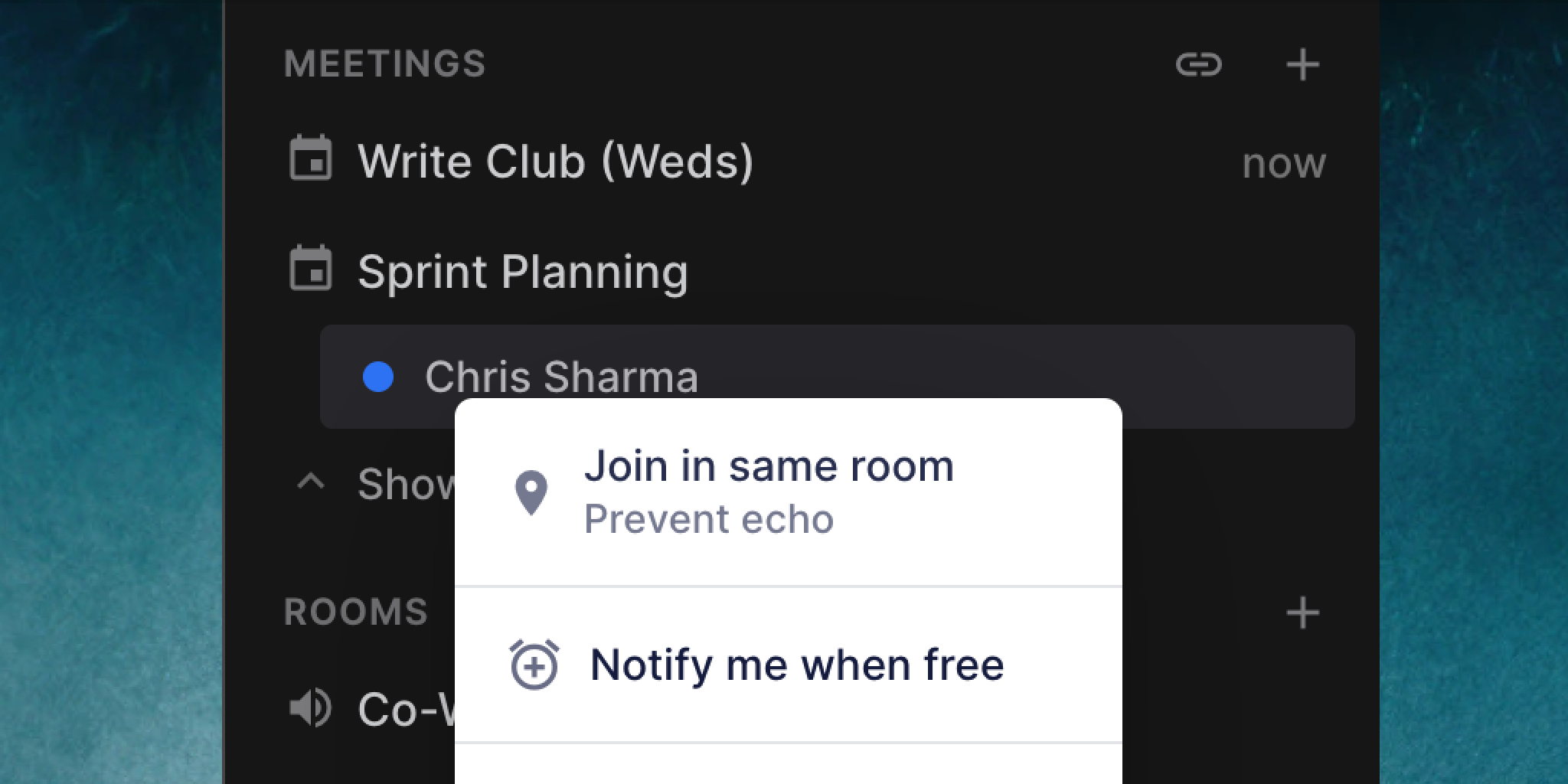 You can also join a meeting in Same Room mode by right-clicking on a meeting participant.