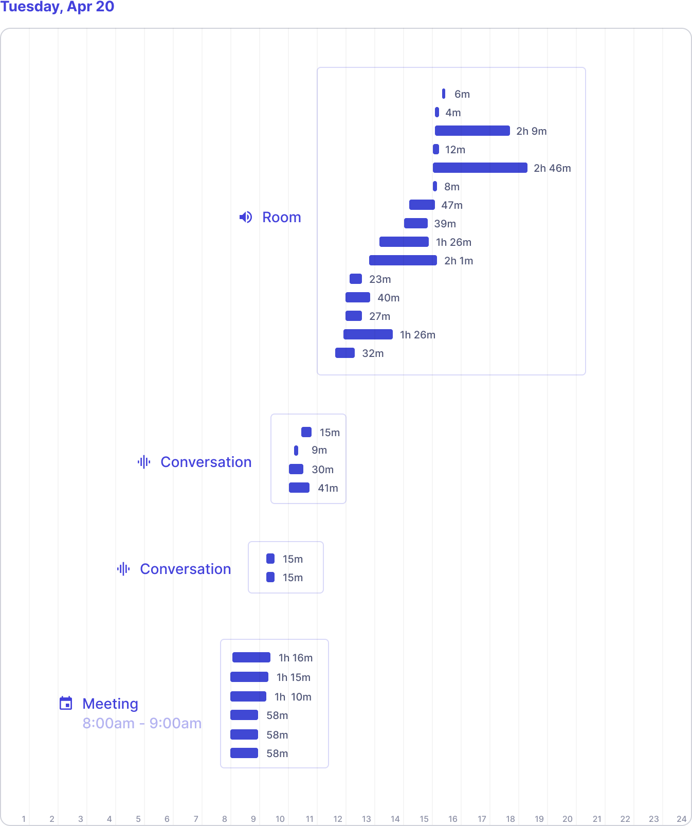 Room usage from a team on Tandem. Blue bars are time in a call. Note the combination of short "bursty" talks and longer co-working.
