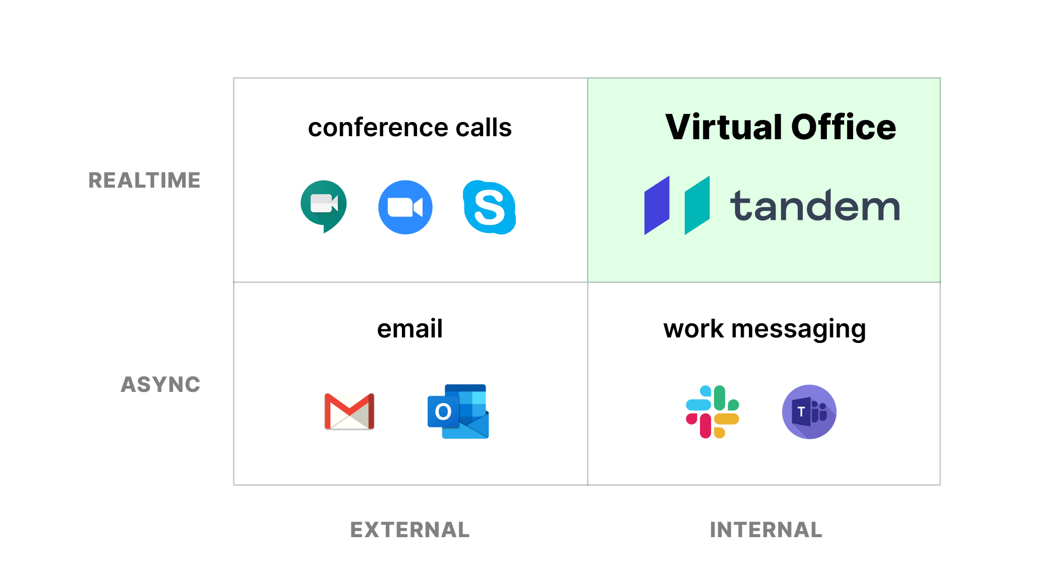 What we saw in 2019, everyone saw. Companies of all sizes, from startups to Fortune 500s, needed a Virtual Office. We quadrupled our team to meet the need. The blogosphere and media took note, adding Tandem and other newly launched Virtual Offices into roundups of "remote tools" and "collaboration tools". While not wrong, they failed to capture what makes the Virtual Office a distinct product category.