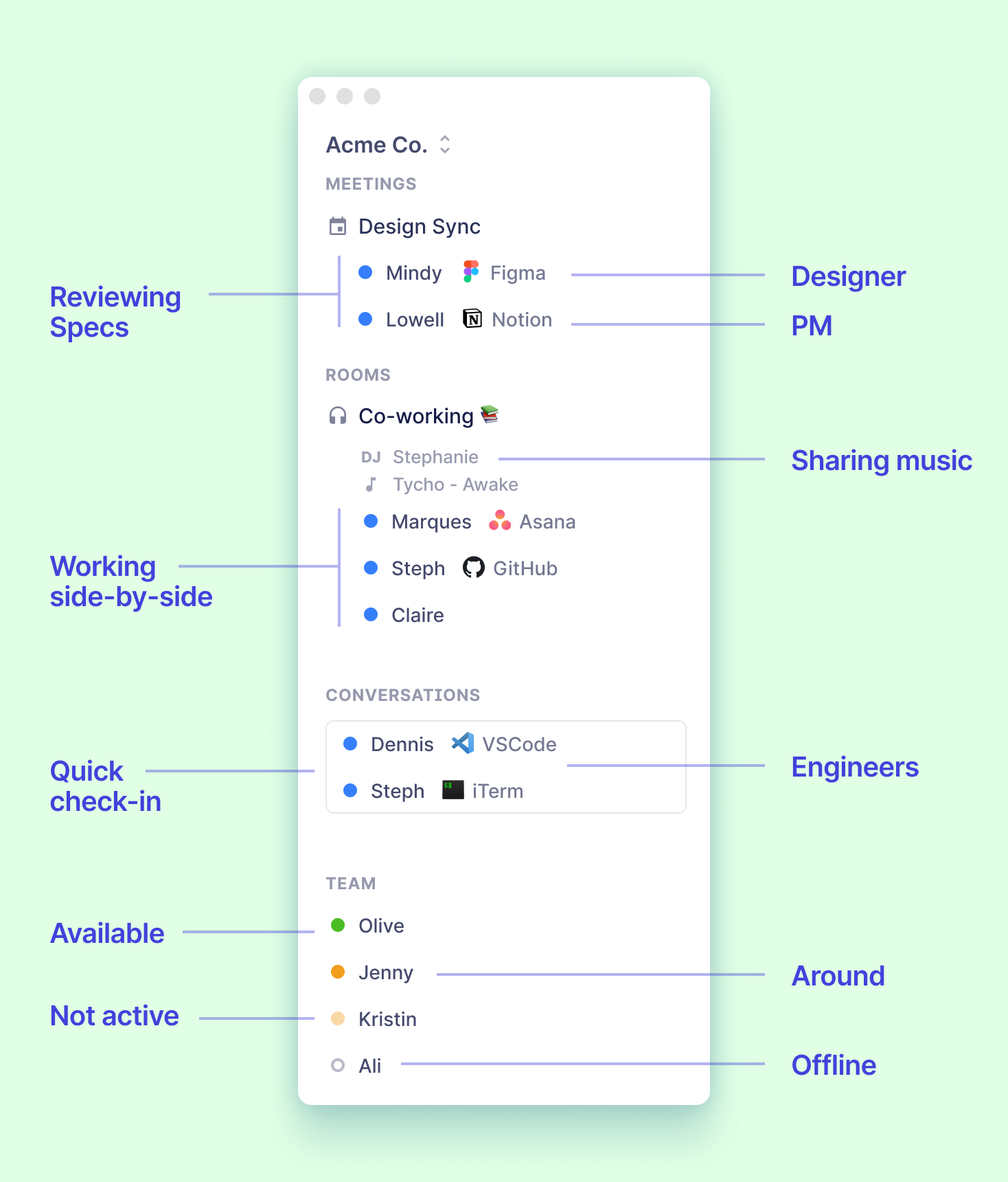 A Tandem Virtual Office. Active work apps (e.g. VS Code, Google Docs) give a sense of presence. Seeing teammates in Rooms and Meetings give you an awareness akin to a physical office, and the ability to drop-in.