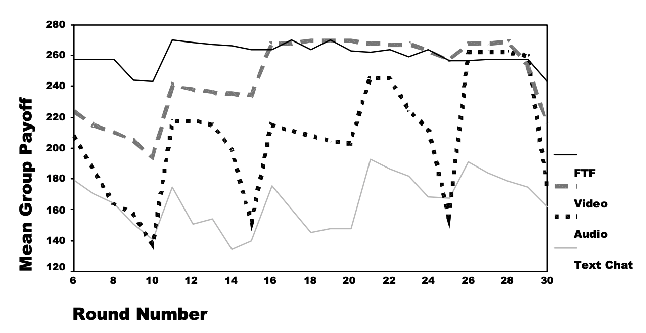 [1],[4],[7] In Being there versus seeing there: Trust via video (2001), Bos, Gergle, Olson, and Olson show how group trust builds over time, as measured by mean payoff in a social dilemma game. Note that audio and video reached in-person (face-to-face) levels of trust, while chat never did.